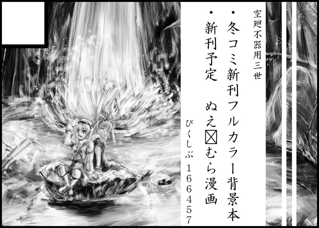 東方の背景メインイラスト本。サイズA4、オフセットフルカラー16P、価格200円。2日目のV-26a「 RIGHT+LIGHT 」(http://blog.right-light.com/)にて委託で置かせて頂きます。また、ゲストにもサメ2009さん(http://www.pixiv.net/member.php?id=194937)がとても素晴らしいイラストを寄稿してくださいました。現地には僕もこいしちゃんのコスプレして来ていると思うので、2日目来る人は僕と握手!お願いしますw